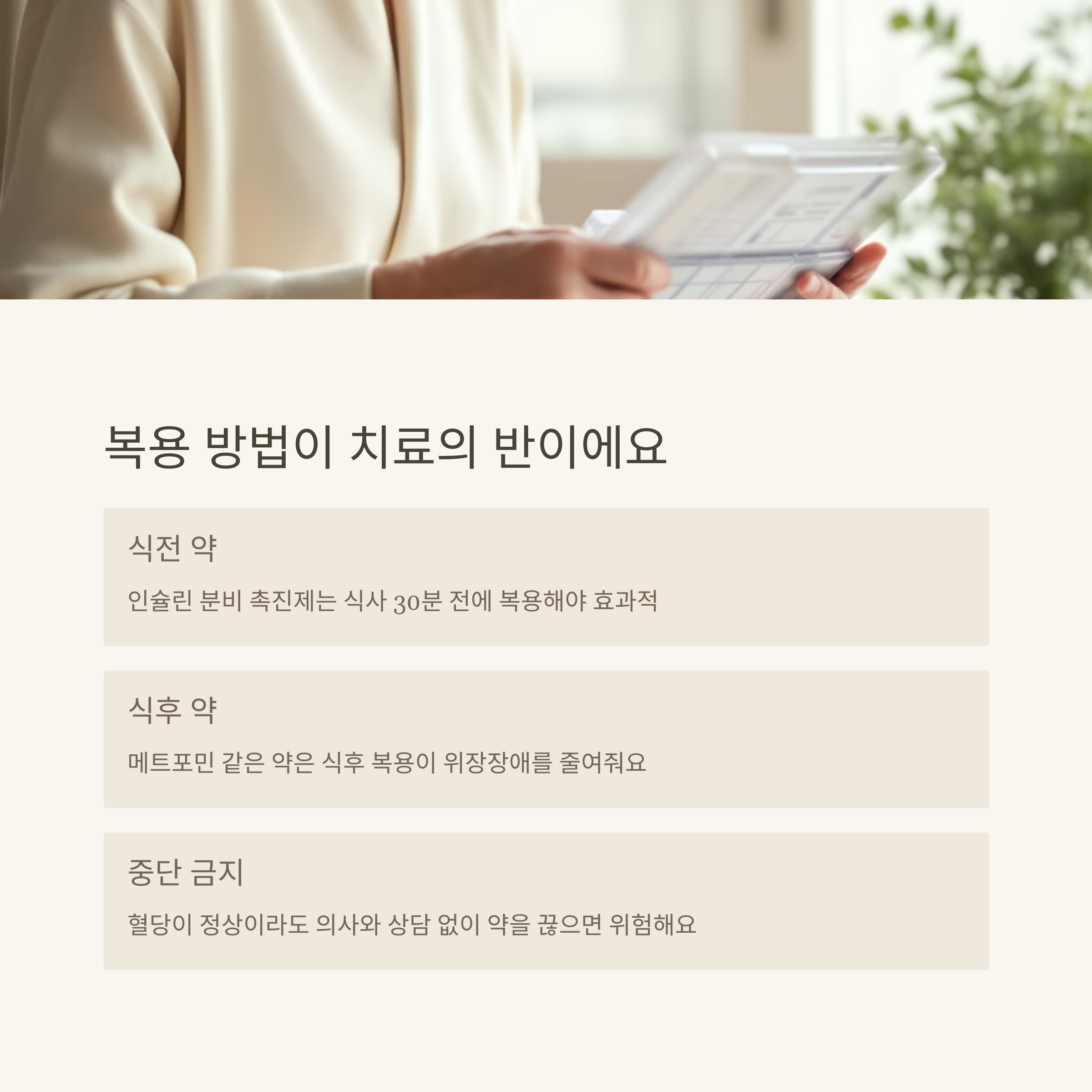 💡 의사와 상의 없이 임의로 약을 끊거나 용량을 줄이는 건 정말 위험해요! 또, 약을 제대로 먹는 시간도 중요합니다. 식전, 식후 등 복용법을 잘 지켜야 약효를 최대한 볼 수 있어요.