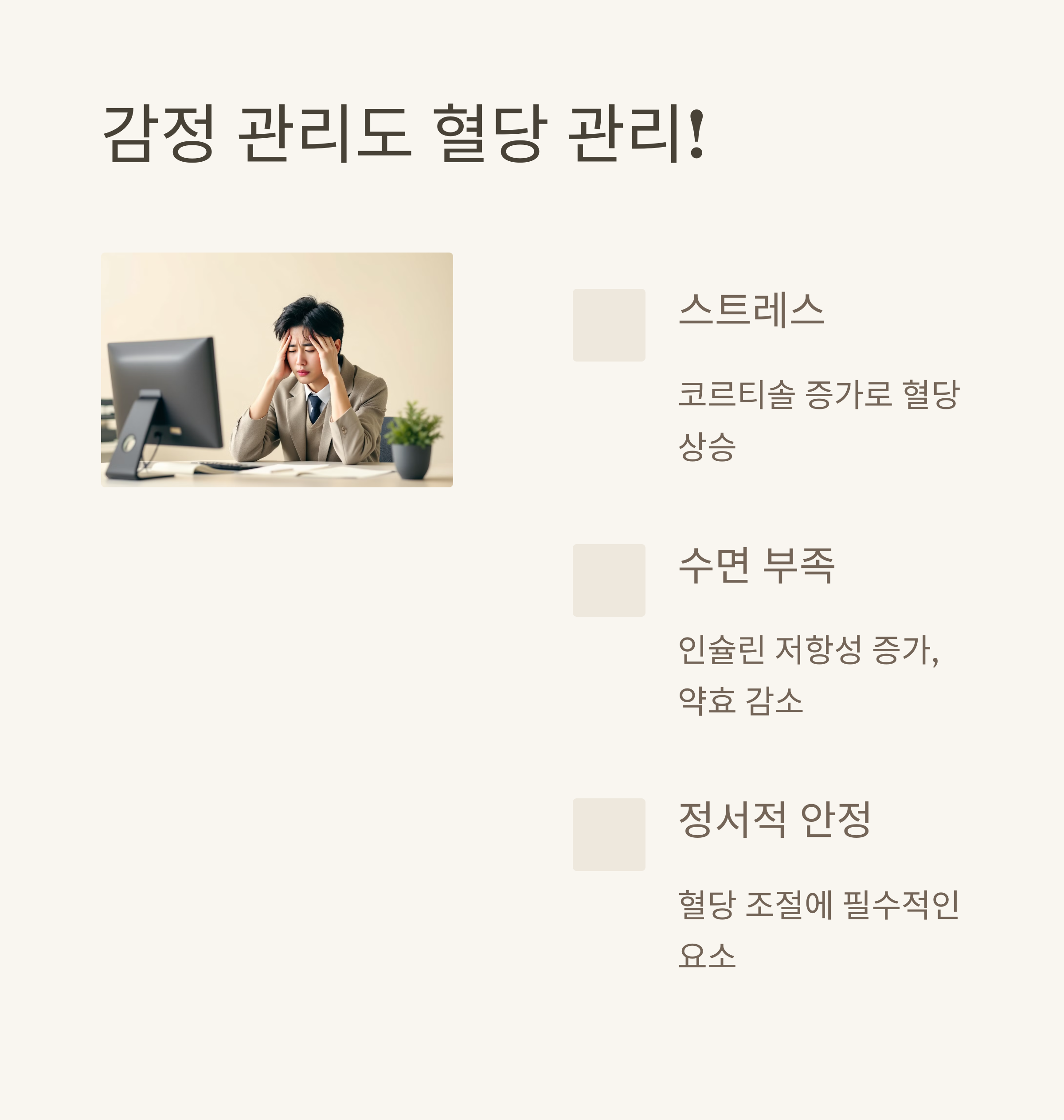 많은 분들이 간과하는 부분인데요, 스트레스와 수면 부족도 혈당을 올리는 주범입니다.