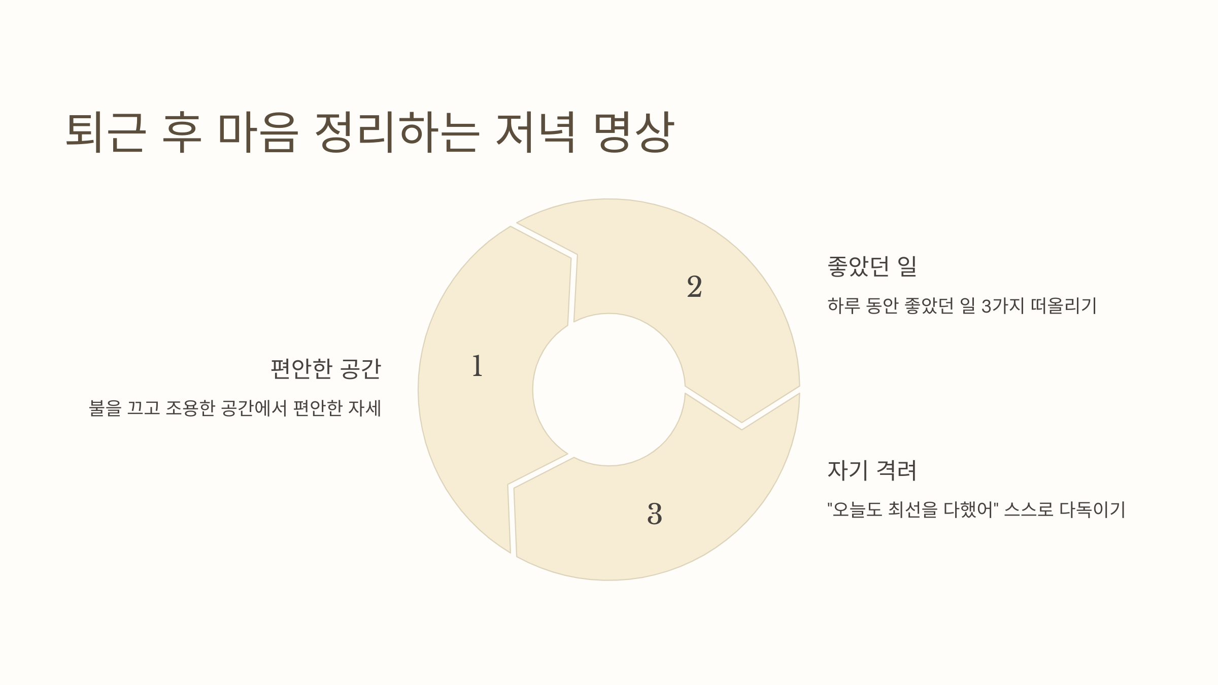 퇴근 후 명상을 하면 숙면에도 도움이 되고, 부정적인 감정을 해소할 수 있어요.